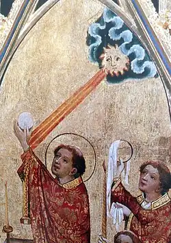 In der Mitte des Altars befindet sich der Mittelschrein mit dem Tabernakel. Dieser unterbricht die Bildzyklen und kragt etwas vor. Das Tabernakelgehäuse ist in der unteren Hälfte mit einem Gemälde der sogenannten Martinsmesse geschmückt, das damit einen Hinweis auf die eucharistische Funktion des Schreines gibt. In der oberen Hälfte befindet sich eine offene Nische mit einer Maßwerkarkade. Möglicherweise wurden in der Nische im Mittelalter unterschiedliche Figuren – Salvator, Muttergottes, Kruzifix – eingestellt, die einen Bezug zu den Ansichtsseiten hatten;[28] heute ist eine Figur des Weltenrichters aus dem 19. Jahrhundert eingefügt.[29] 2007 sind auch die beiden Türen wieder am Altar angebracht worden, mit denen der Mittelschrein verschlossen werden kann. Sie zeigen einen Schmerzensmann und eine Kreuzigung.[30]