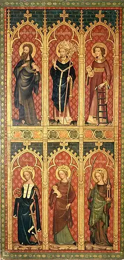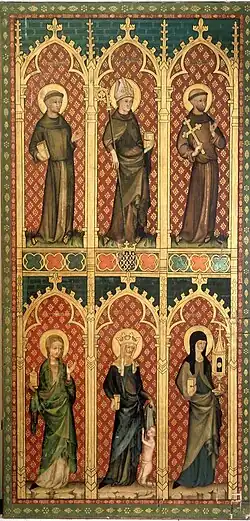 In der oberen Reihe sind von links nach rechts abgebildet Antonius von Padua als Gelehrter, der heiligen Ludwig von Anjou, Bischof von Toulouse, Franz von Assisi, der mit seinen Stigmata und einem Kreuz gezeigt wird, Johannes den Täufer, der das Lamm Gottes trägt, der heilige Bischof Nikolaus von Myra sowie der heilige Laurentius von Rom, der den Feuerrost seines Martyriums hält. Darunter sind abgebildet die heilige Maria Magdalena mit dem Salbungsgefäß, Elisabeth von Thüringen, die die Armen kleidet, und die heilige Clara als Gründerin des Ordens, die heilige Katharina von Alexandrien, die das Rad der Folter trägt, die heilige Agnes von Rom mit dem Lamm und schließlich die heilige Barbara von Nikomedien, die einen Turm trägt.[23]