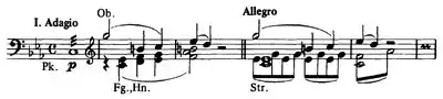 Der erste Satz in klassischer Sonatenform beginnt mit einer kurzen Adagio-Einleitung, um dann als Allegro fortzufahren. Auf das erste Thema in c-Moll folgen ein zweites in Es-Dur und dann die Rückkehr zum ersten Thema in c-Moll. Die Durchführung steht in As-Dur mit dem zweiten Thema in C-Dur, kehrt zur Wiederaufnahme in c-Moll zurück und schließt mit einer Coda in C-Dur ab.