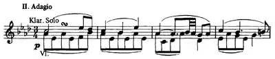 Der zweite Satz, ein Adagio in As-Dur und ohne Durchführung ist um eine einfache melodische Linie aufgebaut, wobei die Soloklarinette nur von den Streichern des Orchesters begleitet wird.