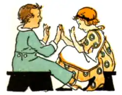 - Meist sitzen dann zwei Mädchen...einander gegenüber, singen ein altes Kinderlied und schlagen ihre Handflächen gegenseitig ineinander, in wechselnder Folge, doch im Rhythmus des Liedes. Zu jedem dieser Lieder gehört eine andere Schlagfolge, die auch das Schlagen eigener Körperteile einschließen kann.[3]