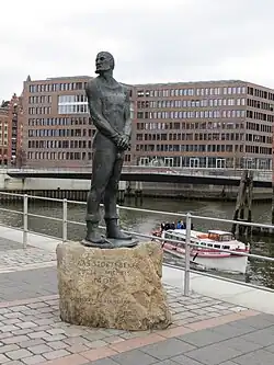 Störtebeker-Denkmal von Hansjörg Wagner auf dem Großen Grasbrook (heute HafenCity, am Störtebeker-Ufer gegenüber dem Internationalen Maritimen Museum) in Hamburg, dem vermuteten Hinrichtungsort