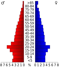 27,3 Prozent der Bevölkerung war unter 18 Jahre alt, 15,7 Prozent zwischen 18 und 24, 27,4 Prozent zwischen 25 und 44, 19,0 Prozent zwischen 45 und 64 und 10,6 Prozent waren 65 Jahre alt oder älter. Das Medianalter betrug 29 Jahre. Auf 100 weibliche Personen kamen 101 männliche Personen und auf 100 Frauen im Alter von 18 Jahren oder darüber kamen 98,5 Männer.