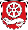 Blasonierung: „In Rot über einem silbernen Wels das silberne Mainzer Rad.“[13]