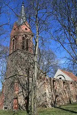 An der Ruine der Kirche St. Timothei wurde bereits saniert, um den Bestand zu schützen. Das Schiff, dem noch große Teile des Daches fehlen, stammt vermutlich aus dem 13. Jahrhundert und wurde überwiegend aus Feldsteinen errichtet. Der Turm wurde im Jahre 1899 hinzugefügt beziehungsweise aufgestockt, wie eine auf der Westseite eingelassene Inschriftentafel belegt.