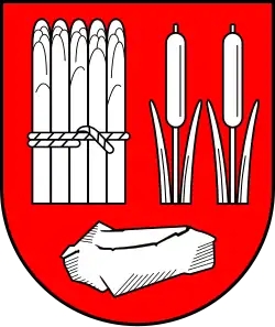 Blasonierung: „In Rot über einem silbernen Bruchstein ein aufrechtes silbernes Spargelbund und zwei silberne beblätterte Rohrkolben nebeneinander.“[8]
