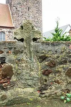 - In die Friedhofsmauer ist ein schönes mittelalterliches Sühnekreuz eingearbeitet.[26]