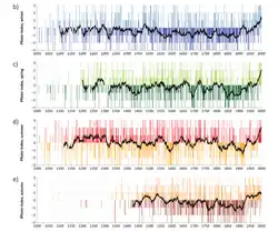 - ↑ a b c Ahmed u. a.: Continental-scale temperature variability during the past two millennia. In: Nature Geoscience. Band 6, 2013, S. 341, doi:10.1038/ngeo1797.