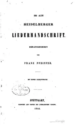 - Franz Pfeiffer: Die alte Heidelberger Liederhandschrift, Literarischer Verein Band IX., Stuttgart 1844