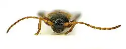 Die Mundwerkzeuge zeigen nach vorn. Die Kiefertaster sind viergliedrig, die Lippentaster dreigliedrig. Die elfgliedrigen Fühler sind beim Männchen etwa körperlang, beim Weibchen überragen sie die Mitte der Flügeldecke. Sie sind rotbraun, zur Spitze hin dunkler werdend und nicht verdickt. Das zweite Fühlerglied ist relativ lang, nicht ringförmig. Das dritte und vierte Fühlerglied sind nicht ausgesprochen kurz. Das fünfte Fühlerglied ist kürzer als das dritte und vierte zusammen. Die Einzelfacetten des Auges sind sehr klein. Sie umgreifen nierenförmig die Basis der Fühler und liegen auf dem Scheitel näher beieinander als die Fühlerbasen.