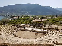 Ursprünglich hatte das Theater Holzbänke, die im Halbrund angeordnet waren, für die Zuschauer. Mitte des 4. Jahrhunderts v. Chr. wurden sie durch Bänke aus lokalem Kalkstein, der in einem Steinbruch nördlich der Akropolis gebrochen wurde, ersetzt. Der Zuschauerraum bot zu dieser Zeit etwa 800 Besuchern Platz. Die Wege wurden mit Steinplatten aus Poros gepflastert. Fast alle Bänke trugen Inschriften mit Namen von Honoratioren und Einwohnern, die sich bei dem Bau verdient gemacht hatten. Die häufige Erwähnung des Dionysos zeigt, dass das Theater diesem Gott geweiht war, mit dem von Pausanias erwähnten Dionysos-Heiligtum[1] in Verbindung stand und rituellen und religiösen Zwecken diente. Im späten 3. Jahrhundert v. Chr. wurde das Theater erweitert und hatte nun etwa 1000 Sitzplätze. Auch aus dieser Zeit stammen einige Inschriften. Die Theaterbühne verfügte – für den Hellenismus typisch – über eine zweistöckige Skene und ein Proskenion.