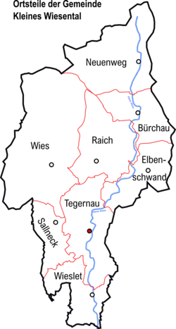 Kleines Wiesental (alemannisch Chlais Wiisedal) ist eine Gemeinde im Landkreis Lörrach in Baden-Württemberg, die am 1. Januar 2009 aus dem Zusammenschluss der bislang selbständigen Gemeinden Bürchau, Elbenschwand, Neuenweg, Raich, Sallneck, Tegernau, Wies und Wieslet entstand.[2] Namensgebend ist der Fluss Kleine Wiese.
