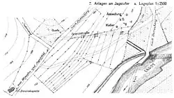 Von dem kleinen Lagerdorf (Vicus) legte die RLK einen rechteckigen, 5,10 m × 2,75 m großen Keller frei, der einst mit Leisten und Hohlziegeln gedeckt gewesen sein muss. Ferner eine 5,10 m × 2,75 m messende Barackengrube, einen Brunnen mit 1,37 m Durchmesser und eine Feuerstelle.