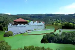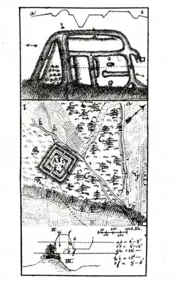 | Wachturm/Burgus Blöcktach | Eine quadratische Wallanlage mit umlaufendem Graben in der Gemeinde Friesenried/Blöcktach, Landkreis Ostallgäu, Schwaben, 30 m nordwestlich der Römerstraße Kempten-Augsburg, wurde erstmals 1841 von Landesgerichtsassesor Stoß beschrieben, rechteckiger Erdwall, 28 × 28 m, 0,6 m breit/hoch. Er hatte die quadratische Wallanlage zunächst für eine villa rustica gehalten. 1927/28 wurden die Turmstelle durch B. Eberl dokumentiert, gleichzeitig erfolgte der Bau eines Wasserspeichers im Zentrum der Anlage.[44] 1958 fand durch die BAdW die erste Grabungskampagne vor Ort statt, welche erstmals eine wissenschaftliche Interpretation der Befunde ermöglichte. Die quadratische Form des Turms (12,5 × 12,5 m), der umlaufende Graben, die Nähe zur Straße Augsburg-Kempten und ein spätrömisches Keramikfragment deuteten auf einen Straßenburgus mit Keller hin. Eine Palisade verlief im Abstand von 6–7 m parallel zum burgus. Wahrscheinlich hatten die dafür benötigen Holzpfosten eine Höhe von 0,45 m. Der Graben in welchem die Pfosten standen war 0,4 m tief und 2 m breit. Die parallel zur Turmsüdseite, in leicht gewölbter Form, verlaufende Römerstraße ist heute noch als 5 m breiter Kiesdamm erhalten. 2010 fanden weitere Messungen im Bereich der obertägig noch erkennbaren Strukturen durch das Bayerische Landesamt für Denkmalpflege statt. Walke nimmt an, dass der burgus zeitgleich mit Baisweil IV erbaut wurde.[45] | |