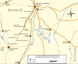 | Wachturm/Burgus Bobingen | Auf dem ehemaligen Friedhof von St. Felicitas wurden römische Siedlungsspuren erfasst. Münzen aus der Zeit von Constantius Gallus (351–354) und Valentinian I. deuten auf einen spätrömischen Befund hin. An der Nordseite der mittelalterlichen Befestigungsmauer (ehemalige Friedhofsmauer) wurden Spuren römischen Backsteinmauerwerks freigelegt. Möglicherweise wird der burgus von einer mittelalterlichen Befestigungsanlage überlagert. Auch im Frühmittelalter wurde die Straße weiter genutzt und von einem Turm unweit des mutmaßlichen burgus gesichert. Bobingen liegt mittig zwischen Rapis/Schwabmünchen und der Statthalterresidenz Augsburg. Für die optische Nachrichtenübermittlung wäre es ein idealer Standort gewesen.[40] | |