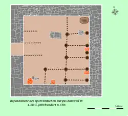 - ↑ Franziska Sophie Reinhart: Wachttürme und burgi im Hinterland des raetischen Limes in der mittleren und späten Kaiserzeit. Masterarbeit im Studiengang Provinzialrömische Archäologie. Ludwig-Maximilians-Universität München Institut für Vor- und Frühgeschichtliche Archäologie und Provinzialrömische Archäologie. München 2022, S. 41.