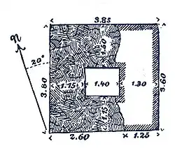 | Größe | Umfassungsmauer: 61,85–64,50 m × 52,50–54,75 m |