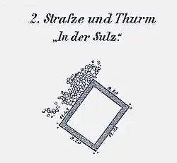 Mittels Sondierungsgrabungen wurden die Fundamente an mehreren Stellen sichtbar gemacht. Durch Vermessung des Grundrisses konnte der Beweis für die Übereinstimmung dieser Mauerreste mit den von Groller beschriebenen Turm erbracht werden (Maße 9,45 × 11,20 m). Beobachtet wurde in weiterer Folge, dass das aufgehende Mauerwerk durch intensive landwirtschaftliche Nutzung des Fundortes und seiner Umgebung mittlerweile fast vollkommen verschwunden war. Stellenweise konnte nur noch die unterste Schicht der Fundamente beobachtet werden. Das antike Straßenniveau war nicht mehr festzustellen. Relativ gut erhalten war nur noch das Fundament der Ostecke, von der Westecke war nur noch die geschotterte Unterlage vorhanden. Der Innenbereich war in Längsrichtung (NO-SO) abgeteilt. Die Lehmfundamente der Innenmauer ragten 3,20 bis 3,15 m vor. Am NO-Lehmfundament konnten weiters Spuren einer Feuerstelle festgestellt werden. Funde von Dachziegelbruch und Keramikscherben bewiesen eindeutig den römischen Ursprung der Mauerreste, was seinerzeit von Kubitschek noch bestritten wurde.[11] Die Fundamente in der Breite von 0,70 m wären durchaus in der Lage gewesen, noch ein zusätzliches Stockwerk zu tragen. Für einen einfachen Signalturm war das Gebäude zu groß. Obwohl es in einer Mulde lag, wäre für eine gute Sichtverbindung nach Carnuntum schon eine Mindesthöhe von rund vier Meter ausreichend gewesen. Im Erdgeschoss konnten eventuell auch Zug- und Reittiere oder eine größere Anzahl von Personen untergebracht werden. Die Feuerstelle diente wohl zur Essenszubereitung. |