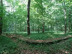 | Wp 8/6 | „Kühbaum“ | ![]() Der auf dem Kühbaum gelegene Turm wurde am Westrand der Kuppe im Bereich einer mächtigen Steinrutsche entdeckt[18] und durch Suchschnitte gesichert, die Karl Schumacher (1860–1934) im Auftrag der Reichs-Limeskommission (RLK) vornahm. Von der bereits damals stark zerstörten Turmstelle waren noch „Mauersteine, Mörtelbrocken und römische Scherben“ auszumachen. Heute ist an dieser Stelle nichts mehr zu sehen.[8][19][20] |