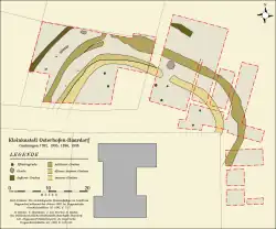 Nach dem maschinellen Oberbodenabtrag und dem Putzens des Planums hoben sich 1992 drei parallel verlaufende Gräben deutlich vom Boden ab.[1] Letztendlich konnten an der 55 × 55 Meter (= 0,30 Hektar) großen Anlage insgesamt vier Gräben beobachtet werden, die zu zwei Bauphasen mit je zwei Doppelspitzgräben gehörten.[5] Möglicherweise setzte der äußere Graben an der zum Ufer abfallenden Seite aus. In diesem Bereich hat er jedenfalls keine Spuren hinterlassen. Durch die Art der erhaltenen Pfostenstellungen konnten die Ausgräber eine als Holz-Erde-Konstruktion angelegte Umfassungsmauer erschließen. Bereits 1992 ließ sich aus den rekonstruierbaren Ausbauspuren des Lagers eine nutzbare Innenfläche von rund 40 × 40 Metern (= 0,16 Hektar) errechnen.[1] Es wäre also Platz für zwei Mannschaftsbaracken mit 20 bis 30 Soldaten vorhanden gewesen.[2]
