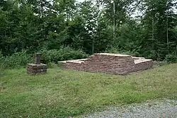 | Wp 10/37[A 3] | „In der Schneidershecke“ | ![]() ![]() ![]() ![]() Wp 10/37 ist unter allen Limestürmen einer der ungewöhnlichsten Befunde und gibt der Wissenschaft bis heute Rätsel auf. Das erstmals von dem Landgerichts-Assessor und Ortshistoriker Andreas Debon erwähnte Areal, wurde im Mai 1884 durch den Limespionier Wilhelm Conrady (1829–1903) und den Leiter der Großherzoglichen Altertümersammlung, Ernst Wagner (1832–1920), ergraben. Ihre Untersuchungen setzte der Oberförster Langer aus Schloßau fort. Gefunden wurde eine Holzturmstelle mit einem Gesamtdurchmesser von 20 m sowie zwei Steinturmstellen. Beide Steinturmfundamente sind rekonstruiert. Der westlich gelegene hat mit 6 × 6 m gewöhnliche Ausmaße. Ungewöhnlich am östlich gelegenen, 6,60 × 6,60 m großen Turm ist eine an die Nordseite später angefügte Treppe. Eine Weihinschrift[2] an Jupiter befand sich in die Freitreppe eingemauert. Sie wurde gesetzt für die Einlösung eines Gelübdes für die Fertigstellung des burgus und bezieht sich wahrscheinlich auf den westlichen Turm.