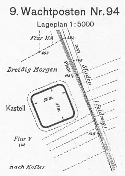 Der Limes verläuft in der Florstädter Gemarkung durch intensiv landwirtschaftlich genutztes Areal und ist nicht sichtbar, ebenso wie das südsüdöstlich anschließende Kleinkastell Stammheim, zu dem die Entfernung 1600 m beträgt. Da die Mitte dieser Strecke genau in einer Talsenke liegt, wurden von der Reichs-Limeskommission zwei Wachtürme zwischen den Kleinkastellen vermutet (Wp 94a und 94b).[1] Archäologische Befunde liegen zu keinem der beiden Standorte vor.