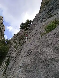 Ein Klettergarten ist ein in einer Felsgruppe gelegenes Klettergelände, in dem einfache bis schwierige Touren vorzufinden sind. Die Felsgruppe kann eine natürliche Felswand oder ein Steinbruch sein.[1] Charakteristisch ist, dass dieses Klettergelände in der Höhe meist auf eine Seillänge (ca. 50 m, oft aber auch bis zu 30 m) begrenzt ist, darüber wird vom alpinen Fels gesprochen, wobei die Übergänge fließend sind.[2] Ein Klettergebiet kann einen, mehrere oder auch viele Klettergärten oder Sektoren umfassen, allerdings werden in der öffentlichen Diskussion die Begriffe Klettergebiet und Klettergarten oft synonym verwendet. Klettergärten werden eingerichtet, d. h. mit Bohrhaken, Umlenkern und ähnlichem versehen, um ein gefahrloses Klettern zu ermöglichen.[3]