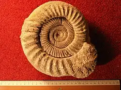 In Beggingen entdeckte 1962 ein Schüler einen Wirbelknochen eines Ichthyosauriers aus dem Schwarzjura mit zwölf Zentimetern Durchmesser. Die folgenden Grabungen ergaben ein Schwanzstück von ca. 1,20 m länge. Beim Bau der A 98 fand man 1991 ein kleines Kieferstück mit drei Placoduszähnen.[8] Gefunden werden jedoch vor allem häufig vorkommende Fossilien, angefangen von Seelilien des Muschelkalks, Ammoniten, Muscheln, Schnecken und Brachiopoden des Jura, Belemniten aus dem Schwarzjura bis hin zu Haifischzähnen des Miozän.
