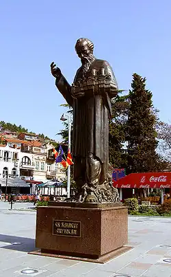Kliment von Ohrid (altbulgarisch: Климєнтъ Охридскїй, bulgarisch und mazedonisch: Климент Охридски Kliment Ohridski; * um 840; † 27. Juli 916 in Ohrid) war einer der ersten mittelalterlichen bulgarischen Heiligen, Gelehrter, Schriftsteller und Aufklärer der Slawen.[1] Er war einer der bekanntesten Jünger der Heiligen Kyrill und Method und wird häufig mit der Erstellung der glagolitischen und kyrillischen Schriften in Verbindung gebracht, insbesondere mit ihrer Popularisierung unter den christianisierten Slawen. Er war der Gründer der geistlichen Schule von Ohrid und wird als der erste Heilige angesehen, der auf altkirchenslawisch gepredigt und gelehrt hat. Er gilt als der erste Bischof der Bulgarisch-Orthodoxen Kirche, einer der sieben Apostel des ersten bulgarischen Reiches und einer der führenden Heiligen des modernen Bulgarien.[2] Die Mission des Heiligen Kliment war der entscheidende Faktor, dass die Slawen in Makedonien in Bulgaren aufgegangen sind.[3] Kliment von Ohrid wird von der Mazedonisch-Orthodoxen Kirchen auch als Gründer des künftigen autonomen Erzbistums von Ohrid geehrt.[4] Der heilige Kliment von Ohrid ist auch der Schutzpatron Nordmazedoniens, der Stadt Ohrid[5] und der Mazedonisch-Orthodoxen Kirche.[6]