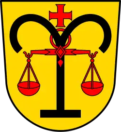 Blasonierung: „In Gold ein schwarzes Gemarkungszeichen in Form einer aus einem Querstrich aufsteigenden und sich oben teilenden Leiste mit eingebogenen Enden, belegt mit einer roten Waage, darüber ein schwebendes rotes Tatzenkreuz.“[14] |