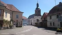1762 entstand eine reformierte Kirche, deren Gebäude mittlerweile als evangelischer Kindergarten fungiert, und 1782 eine lutherische Kirche, die inzwischen das evangelische Pfarramt beherbergt. 1818 fand in der Pfalz eine evangelische Kirchenreform statt, im Zuge derer eine protestantische Union von Lutheranern und Reformierten entstand. 1829 wurden daher die lutherische Kirche abgerissen und nur noch die größere reformierte Kirche genutzt. Diese besaß keinen Kirchturm, sondern lediglich einen Dachreiter. 1848 wurden vor der Kirche ein 30 Meter hoher Turm errichtet und der Dachreiter entfernt. Das königlich bayerische Bauamt in München hatte allerdings davor gewarnt, weil der Untergrund nicht tragfähig war. Im Jahre 1937 wurden der Glockenstuhl erneuert und eine dritte Glocke eingebaut. In den letzten Kriegstagen des Zweiten Weltkrieges wurden eine Panzersperre nahe der Kirche errichtet und dabei das Fundament der Kirche und des Turms geöffnet. Die Kirche wurde dadurch baufällig und musste 1956 abgerissen werden. 1958 wurde die neue evangelische Kirche, erbaut im Stil der Nachkriegsmoderne mit einem separaten, freistehenden Betonkirchturm, eingeweiht. 2024 wurde der inzwischen baufällig gewordene Betonkirchturm aus Sicherheitsgründen wieder abgerissen.[5][6]