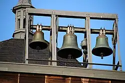 Über der Westfassade hängen in einem offenen Glockenstuhl aus Stahl drei Bronzeglocken der Glockengießerei Feldmann & Marschel aus dem Jahr 1956.