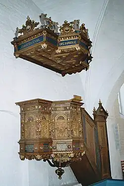 Die Kanzel wurde 1609 aus der testamentarischen Stiftung von Birgitte Ahlefeldt finanziert und 1610 von „Henrich Bildesnider to Flensborg“, also Heinrich Ringerink, fertiggestellt. Die an der Nordwand des Langschiffes befestigte Emporenkanzel entspricht dem verbreiteten Westflensburger Kanzeltyp. Die Treppe ist eine spätere Ergänzung. Die Bildfelder der Kanzelbrüstung enthalten sechs Reliefs mit Szenen aus der Heilsgeschichte, die mit hochdeutschen Bibeltexten erläutert sind. Zwischen den Bildfeldern befinden sich die jeweils mit Namen bezeichneten Schnitzfiguren des Heilands und der elf Apostel. Der Schalldeckel trägt zwischen Putten mit Marterwerkzeugen Platten mit Frauenköpfen und das Stifterwappen. Kanzel und Schalldeckel sind mit Engelsköpfen verziert.