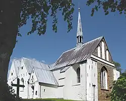 Der Vorgängerbau, der wohl im 12. Jahrhundert entstand, wurde in der ersten Hälfte des 15. Jahrhunderts abgerissen. Baumaterial dieser älteren Kirche wurde für den Neubau wiederverwendet.[16] Die gotische Kirche besteht aus einem kurzen, zweijochigen Langschiff, das Mitte des 15. Jahrhunderts errichtet wurde, und einem etwas jüngeren, fast ebenso langen und breiten, aber höheren dreijochigen Chor, dessen Konsolen mit Köpfen verziert sind. Um 1500 wurden im Süden an das Langschiff das Waffenhaus und im Norden an den Chor die kleine St.-Hjælpers-Kapelle angebaut, die heute als Sakristei und „Uhrenhaus“ für das Werk der Uhr im Dachreiter dient.[5] Etwas später entstanden zwei weitere Kapellen südlich und nördlich vom Langschiff, durch die die Kirche einen – passend zum als wundertätig angesehenen Kruzifixus – kreuzförmigen Grundriss erhielt. Diese beiden westlichen Kapellen waren Grabkapellen der Gutsherren aus der Familie Ahlefeldt. Zuletzt wurde die Lücke zwischen südlicher Grabkapelle und Waffenhaus durch eine weitere Kapelle geschlossen, die ebenfalls als Grablege diente. Die beiden südlichen Grabkapellen wurden später zum Kirchenschiff hin geöffnet. Alle Gebäudeteile haben Kreuzrippengewölbe. Über dem Chor erhebt sich ein Dachreiter, der einen älteren Dachreiter auf dem Langschiff ersetzte, von dem sich noch Spuren im Dachstuhl finden. Bis auf die ziegelsichtige Chorwand ist die gesamte Kirche von außen weiß verputzt.
