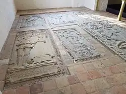 Die sechs Grabsteine in der Südkapelle sind teilweise wiederverwendete ältere Grabplatten.[29] Alle Männer tragen als Zeichen ihres Rangs Rüstungen.