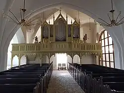 Marcussen & Søn in Apenrade stellte 1882 die jetzige Orgel mit 14 Registern her, für die eine neue Empore und ein neues Gehäuse gebaut wurden. Die Register waren ursprünglich deutsch bezeichnet und anstelle der vierfachen Mixtur befand sich zunächst im ersten Manual das Zungenregister Trompete 8′.[25] Heute lautet die Disposition:[26]