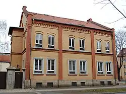 Das ziegelsichtige in massiver Bauweise errichtete Gebäude entstand im letzten Viertel des 19. Jahrhunderts. Die Fassaden sind symmetrisch gestaltet und verfügen am Trauf- und Stockwerksgesims über Ziegelornamente. Als weitere Schmuckelemente kamen Lisenen, Firstbekrönungen und Wandvorlagen zum Einsatz.