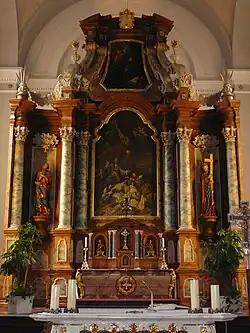 Der 1723 begonnene Kirchenbau konnte erst 1736 vom Eichstätter Weihbischof Johann Adam Nieberlein „unter gewaltigem Zulauf des Volkes“ (Bauer, S. 69) geweiht werden. Der weiträumige Bau mit Dachreiter über dem Chor machte, „da gänzlich schmucklos, einen ziemlich nüchternen Eindruck“ (Hofmann/Mader, S. 16). Noch 1908 waren vier Altäre aus der ersten Hälfte des 18. Jahrhunderts und die 1742 aufgestellte Kanzel vorhanden. Eine Mondsichelmadonna aus dem Anfang des 16. Jahrhunderts stand in einer Nische der Westwand. Seit 1961 dient die profanierte Kirche als Pfarr- und Jugendheim der katholischen Stadtpfarrei St. Walburga.