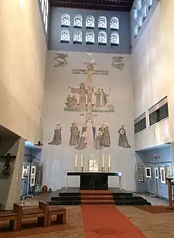 Zusammen mit einigen Lehrenden der Kunstgewerbeschule Aachen gestaltete Böhm die Räume der Klosterkirche. So stellten beispielsweise Anton Wendling die holzgeschnitzten Altarbilder für den Haupt- und die Seitenaltäre, Maria Hasemeier-Eulenbruch aus Raeren die dortigen Tabernakel sowie die 14 Kreuzwegstationen und den „Schmerzensmann“ im Eingangsbereich her. Als nicht zur Aachener Gruppe zählende Künstler schufen die Würzburger Kirchenmaler Willi Jakob (1895–1967) und Willi Wolf (1896–1958) das große Altarfresko mit der Kreuzigungsszene sowie Pater Geraldo Roderfeld das Wandgemälde auf der Nordinnenwand, das einen überlebensgroßen Christophorus darstellt, und die holzgeschnitzte Pietà.