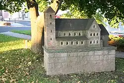 Ein Modell des Klosters steht auf dem Schillerplatz, ein weiteres im Bürgerhaus, wo auch andere Klosterrelikte ausgestellt sind. Der Flügelaltar des Klosters aus dem Jahr 1440 wurde in die Stadtkirche gebracht, wo er im 17. Jahrhundert in einen neuen Altar integriert wurde.[38] Einige der Funde aus den Ruinen, darunter ein Basilisk, die im Landesmuseum für Vorgeschichte (Halle) aufbewahrt werden, wurden im Juni 2020 der Öffentlichkeit präsentiert. Sie sollen restauriert werden und dann in einer Dauerausstellung zu sehen sein.[43][44] Auch im Bode-Museum in Berlin befinden sich mehrere Fragmente. Ehemalige, unterirdische Klostergänge wurden wieder sichtbar gemacht.[45][46][47][48][49] Neben dem Glockenturm steht seit dem Jahr 1999 eine Figurengruppe, die an die Gründung des Klosters erinnert.[50]