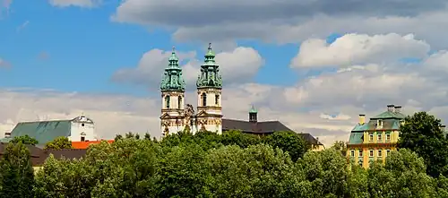 Die Klosterkirche wurde bereits 1292 durch den Breslauer Bischof Johannes Romka eingeweiht. An ihrer Stelle wurde unter Abt Innozenz Fritsch in den Jahren 1728–1735 eine Barockkirche errichtet, an der im 17. und 18. Jahrhundert die bekanntesten Künstler Böhmens, Mährens, Österreichs und Bayerns wirkten.[16] Der Entwurf wurde aus dem Kreis um Kilian Ignaz Dientzenhofer beeinflusst. Die Bauleitung lag in den Händen des Stiftsbaumeisters Joseph Anton Jentsch aus Hirschberg. Die Entwürfe für die bildhauerisch gestaltete Fassade, die – bei ungewöhnlich starker Betonung der Vertikalen – horizontal in drei Geschosse gegliedert ist, schuf Ferdinand Maximilian Brokoff. Nach seinem frühen Tod übernahm sein Schüler Anton Dorazil mit einer Bildhauerwerkstatt aus Prag die Leitung der Arbeiten. Ihm folgte Dorazils Schwiegersohn Joseph Anton Lachel.