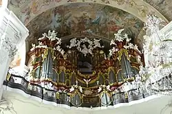 - Die Orgelempore wird vollständig durch den Prospekt ausgefüllt. Die Entwürfe der Figuren stammen von F. M. Brokoff, Ausführung durch A. Dorazil, der auch die zwei Engel mit Weihwasserschalen unter der Orgelempore schuf.