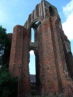 Die heute als Ruine erhaltene Stiftskirche wurde vermutlich in der ersten Hälfte des 14. Jahrhunderts errichtet. Sie war als dreischiffige Backsteinhalle ausgeführt und verfügte über vier Joche. Die ursprüngliche Gestaltung des östlichen Abschlusses ist unbekannt.