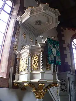 Gemäß dem neuen Geist der Reformation mit den Schwerpunkten auf Wortverkündigung, Lobgesang und Kirchenmusik wurden Kanzel und Orgel besonders betont. So errichtete man 1708 die Orgel hinter dem Altar in ganzer Breite des Chorhaupts, zur gleichen Zeit im vorderen Drittel der dem Kloster zugewandten Seite eine neue Kanzel, deren Korpus auf einer spiralförmig gedrehten Säule ruht. Auch die Kanzelecken weisen ähnliche Säulchen und Brüstungsfelder mit Ranken und Blättern auf. Auf dem Schalldeckel erhebt sich der auferstandene Christus mit der Kreuzesfahne. An der Stelle dieser Kanzel stand früher der ornamentierte steinerne Taufstein, den der Klosterverwalter Jakob Tulschack 1611 gestiftet hatte. Bei der Errichtung der Kanzel wurde der Taufstein umgesetzt. Über dem Altar hängt seit dem 18. Jahrhundert ein lebensgroßes Kruzifix.