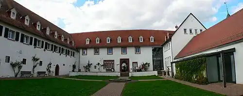 Nach der Renovierung des Propsteigebäudes,[23] des Konventbaus und des Refektoriums wurde der alte Hospitalsaal durch eine neue Aula ersetzt. Als Ersatz für die alte Wohnung im Konventbau erhielt der Gemeindepfarrer ein Pfarrhaus unmittelbar neben dem Kloster. Schließlich wurde der „Neue Bau“ dem Komplex hinzugefügt und am 16. Juni 1962 das „Evangelische Jugendzentrum Kloster Höchst“ eröffnet.