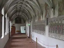 Im Kreuzgang befindet sich ein Malereizyklus aus dem 16. Jahrhundert. Er erhielt sein heutiges Aussehen unter Äbtissin Veronika von Rietheim. Das Deckengemälde stellt Pflanzenranken dar. Die Wandmalereien im Nordflügel bilden eine Galerie der Äbtissinnen mit 25 Porträts, die mit Veronika von Rietheim endet. Daneben stehen Bilder der Passion Christi. Im Ostflügel wird das Leben verschiedener Heiliger dargestellt. 1970 erlitten die Malereien einen Wasserschaden. 2017 wurden die Wandmalereien untersucht, um sie fachgerecht restaurieren zu können.[3]