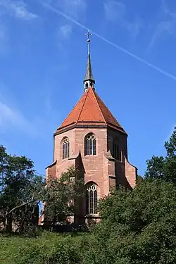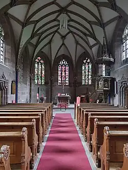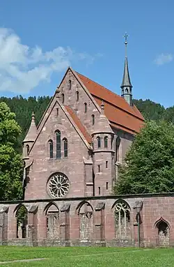 Seit dem frühen 18. Jahrhundert nutzt die evangelische Kirchengemeinde Hirsau die spätgotische Marienkapelle als Pfarrkirche.[20][21] Sie war als einziges Gebäude beim großen Klosterbrand von 1692 unversehrt geblieben. Wenig später wurde dieses Schmuckstück spätgotischer Architektur evangelische Gemeindekirche. Im Obergeschoss hatte sich die Klosterbibliothek befunden. 1888–1892 überarbeitete der württembergische Oberbaurat Karl von Sauter sie im neugotischen Stil. Westwerk, Netzgewölbe und Farbgebung stammen aus dieser Zeit,[14] auch Reste der damaligen Farbverglasung sind im Portal-Tympanon erhalten. Der Glaskünstler Wolf-Dieter Kohler schuf 1970 die drei Chorfenster (links: Geburt und Passion Christi; rechts: Auferstehung und Himmelfahrt; Mitte: der in den Himmel erhöhte, richtende und kommende Herr). Das Chor-Nordfenster von ungefähr 1920 zum Gefallenen-Gedenken 1914/18 hat die Stuttgarter Künstlerin Käte Schaller-Härlin entworfen, die 1917 ihren kurz zuvor geheirateten Ehemann im Krieg verloren hatte.