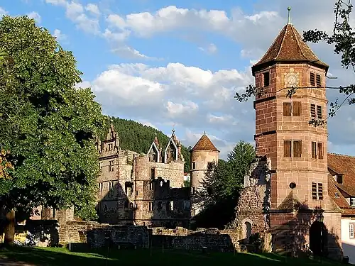 Während einer Belagerung durch französische Truppen unter General Mélac im Pfälzischen Erbfolgekrieg gingen Schloss und Kloster am 19. Septemberjul. / 29. September 1692greg. in Flammen auf. Fehlten zunächst meist nur die Dächer, verlor die Anlage bis 1808 zunehmend auch Mauerwerk, das man u. a. für den Wiederaufbau von Calw verwendete.[18] Erhalten blieben vollständig nur die spätgotische Marienkapelle und der 37 Meter hohe romanische Nordturm (Eulenturm) der Doppelturmfassade am Westzugang der Basilika. Die Lage des südlichen Gegenstücks ist an den freigelegten Grundmauern erkennbar. Vom Schloss und dem spätgotischen Kreuzgang (1474–1503) stehen noch die Umfassungsmauern aufrecht. Kirche und Klausur blieben lediglich in den Grundmauern erhalten. Im Ostflügel des Schlosses wuchs bis 1989 die berühmte Ulme zu Hirsau, der Ludwig Uhland 1829 sein Gedicht Ulmenbaum widmete.[19]