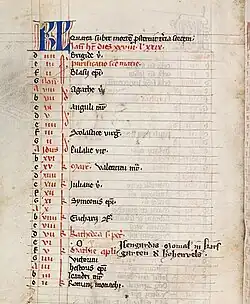 Kalenderblatt „Februar“ aus dem Codex Liechtenthal 37, um 1300, mit Vermerk über eine in Kirschgarten verstorbene Nonne aus dem Geschlecht Bolanden-Hohenfels