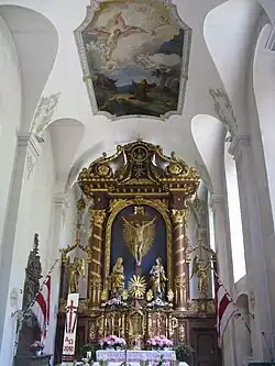 Das Innere ist ein schlichter Saalbau mit vier Jochen, abgetrennt durch toskanische Pilaster, auf denen Kreuzgratgewölbe ruhen. Die Ausstattung entspricht im Wesentlichen dem Barock und dem Rokoko.